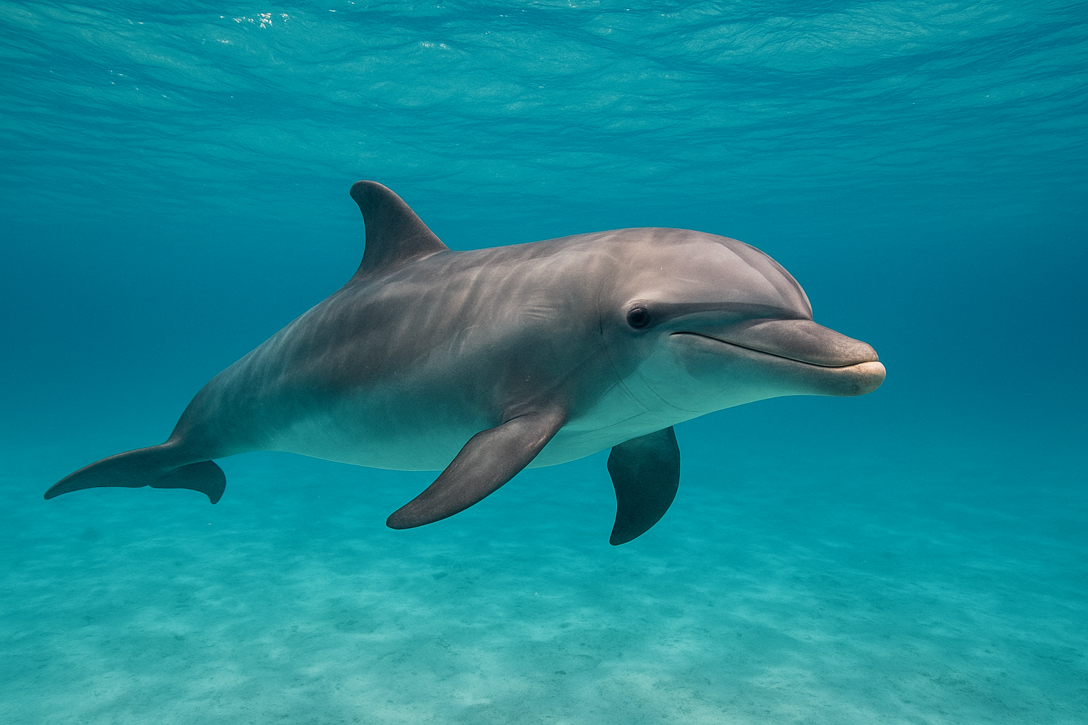 돌고래의 생김새는 물속에서 빠르게 헤엄치기 적합하도록 유선형으로 되어 있습니다. 몸 전체는 매끈하며 피부에는 털이 없고, 대신 물의 흐름을 방해하지 않는 부드러운 질감의 표면을 지니고 있어 속도와 민첩성 면에서 탁월합니다. 머리 부분은 둥글고, 눈은 좌우 양옆에 위치하여 넓은 시야를 가질 수 있습니다. 입은 길게 앞으로 뻗어 있어 일반적으로 '돌고래 웃음'으로 불리는 독특한 미소를 띤 형태를 하고 있습니다. 이 미소는 실제로는 돌고래의 감정을 나타내는 것은 아니지만, 사람들로 하여금 친근감을 느끼게 하는 인상적인 외형 중 하나입니다.